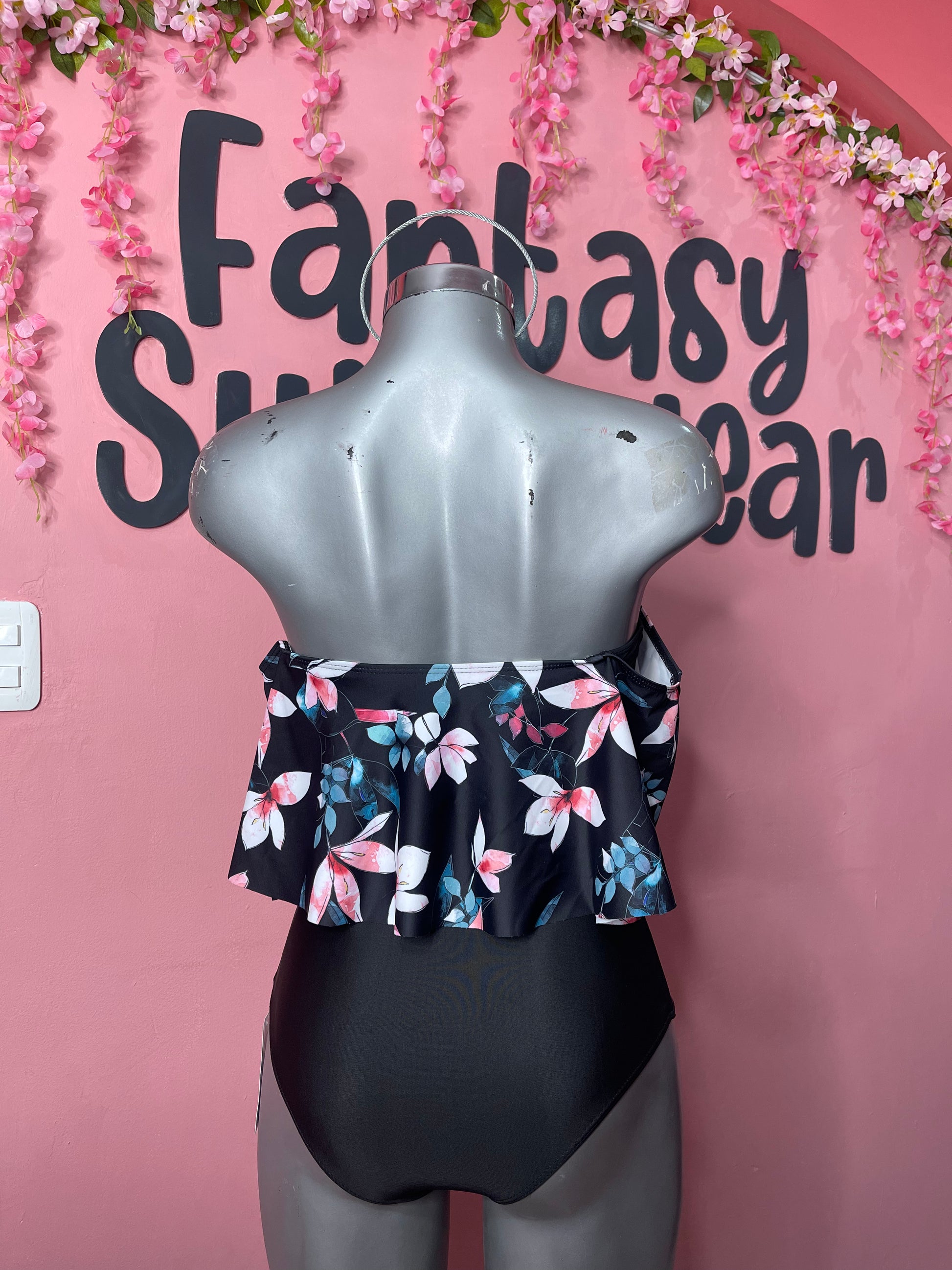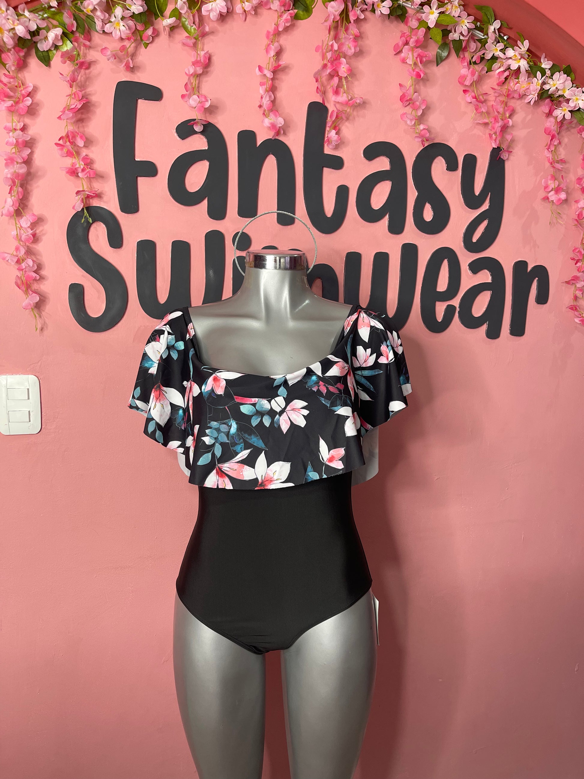 Traje de baño para dama en una pieza con mangas estilo campesino y estampado flor de loto