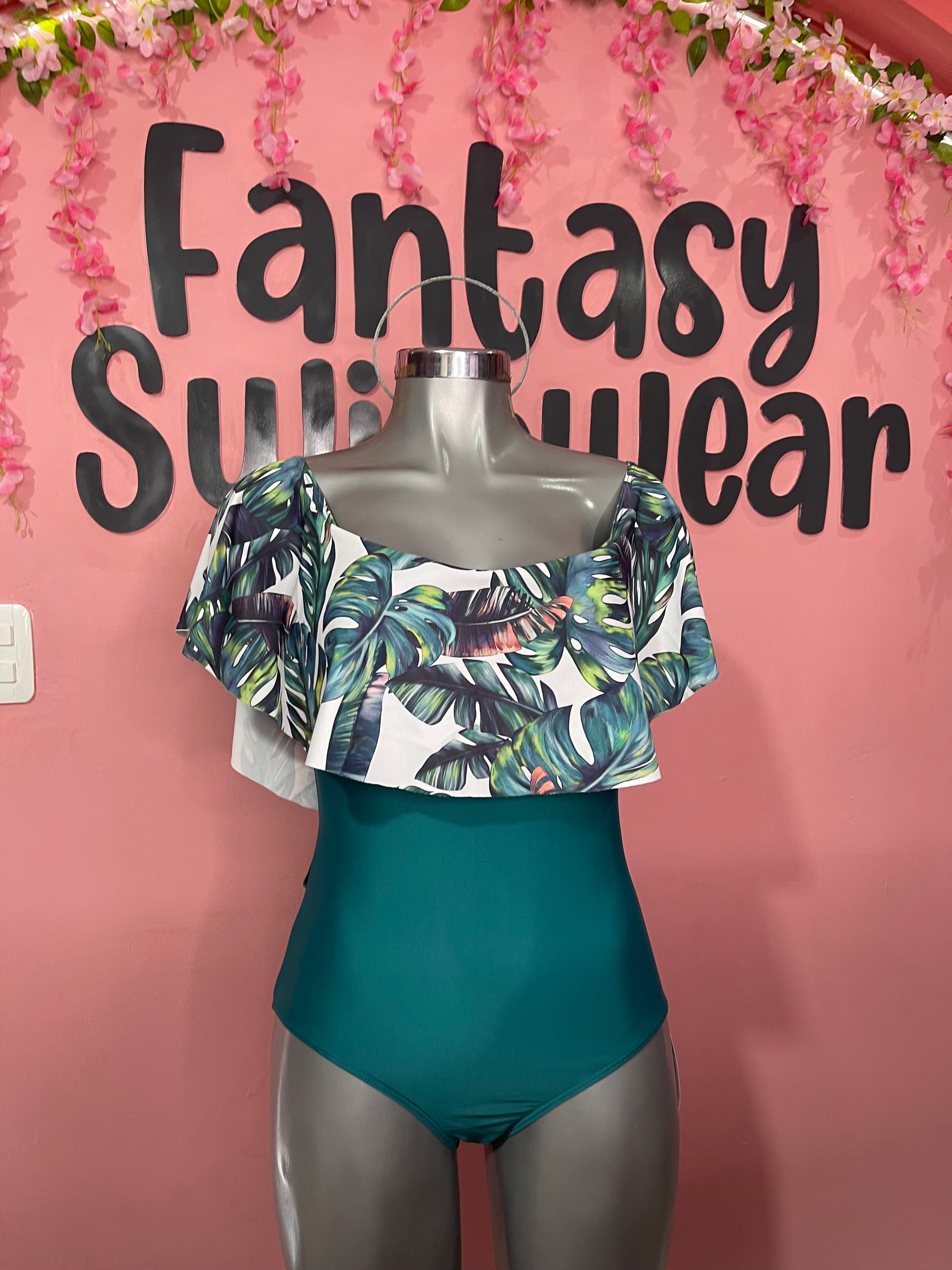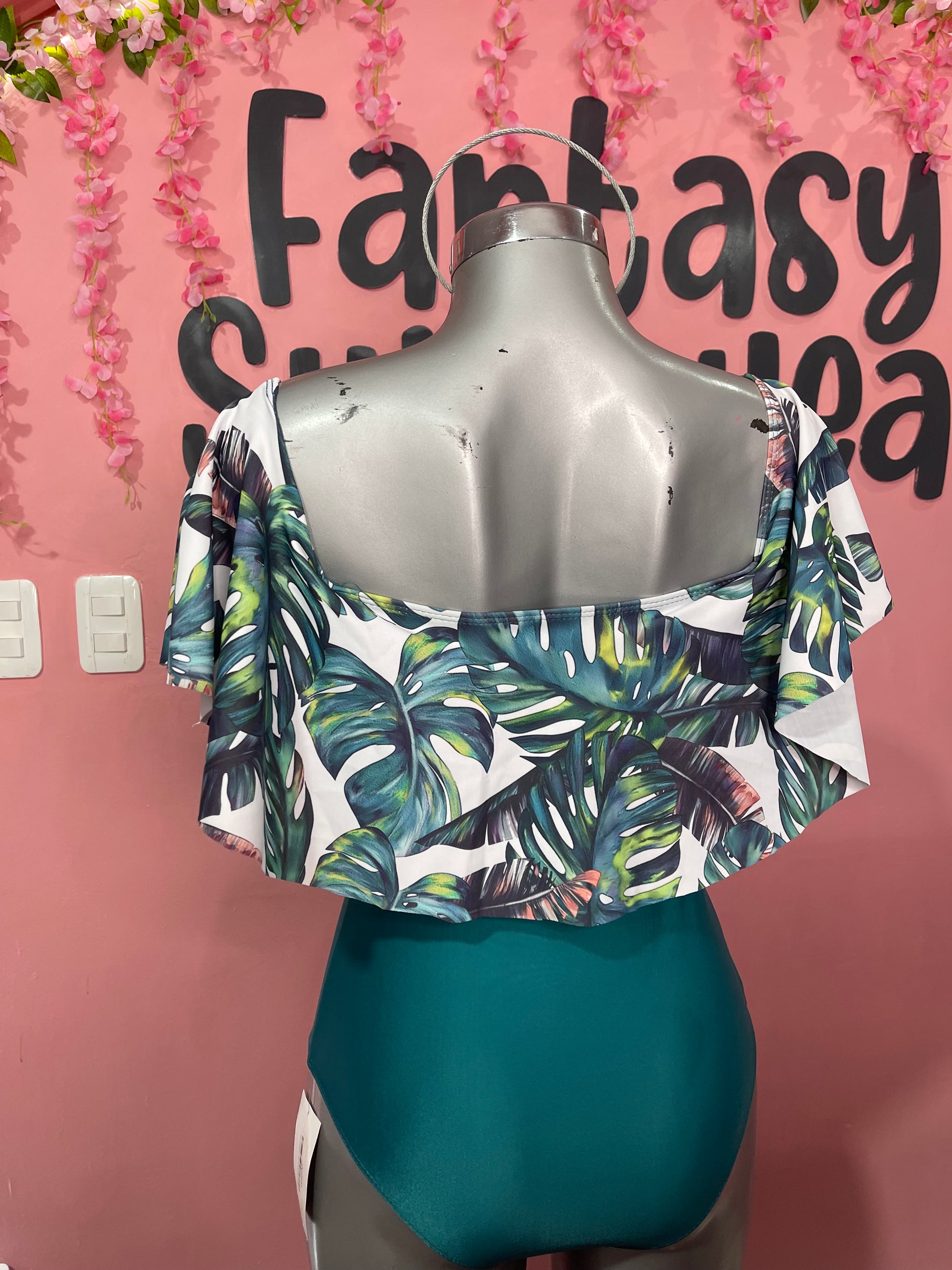Traje de baño para dama en una pieza con mangas estilo campesino y estampado hojas