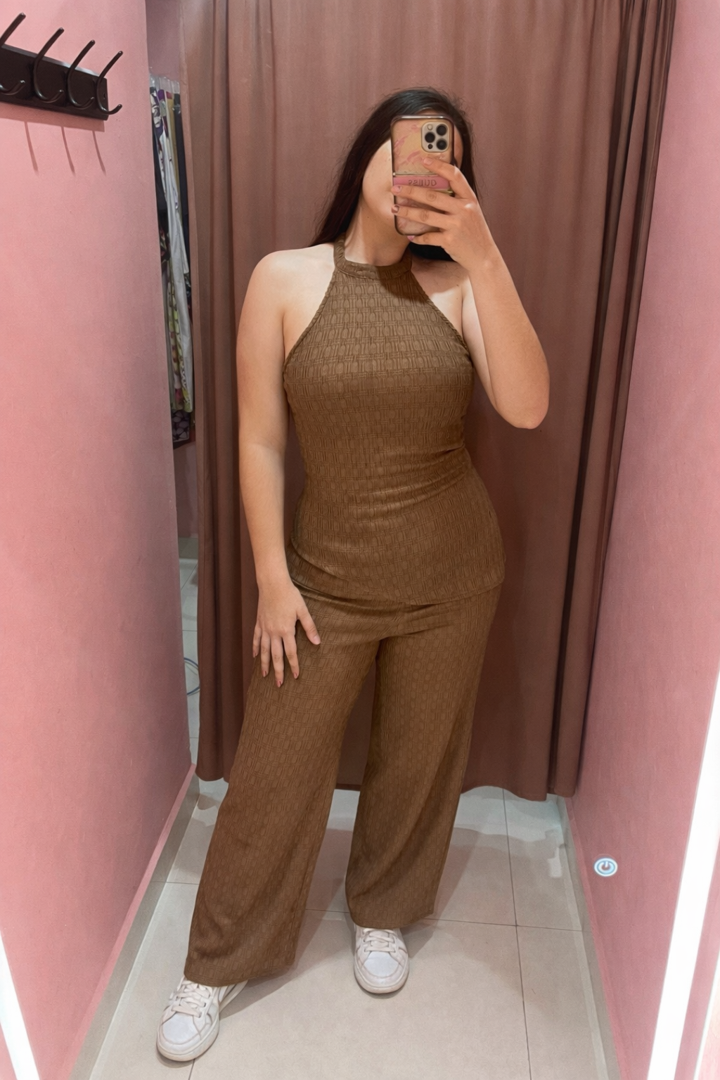 Set de 2 piezas de pantalón y blusa asimétrica tipo halter café